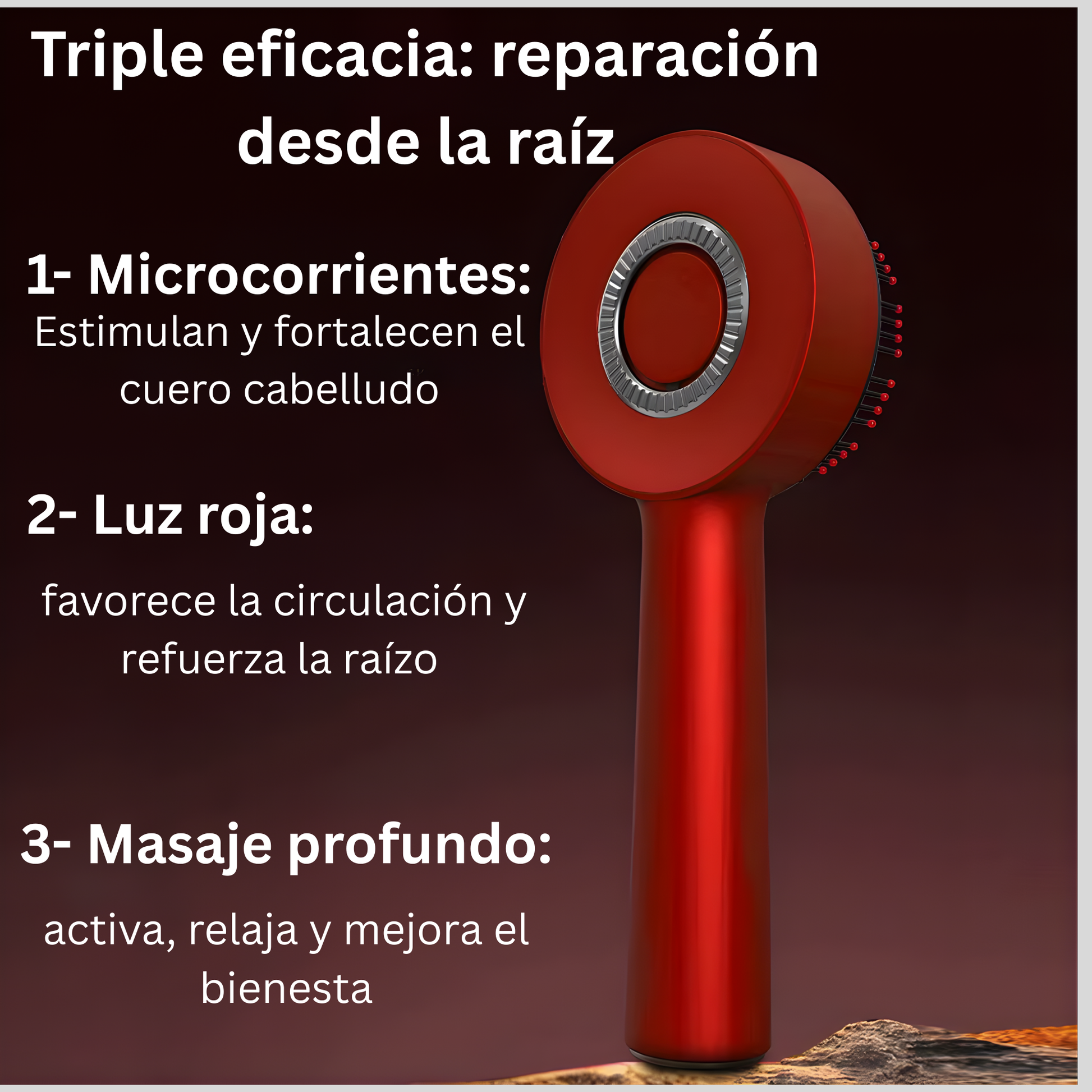 Este cepillo masajeador con vibración y luz roja activa la microcirculación, fortalece la raíz y mejora la salud del cuero cabelludo desde la primera pasada. Sus 3 modos de masaje, tecnología de luz roja 630 nm y aplicación directa de sérum ayudan a crear el entorno ideal para un cabello más fuerte, denso y lleno de vida 🌱